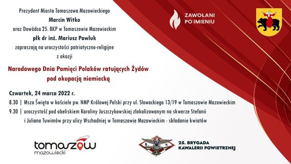 24 marca 2022 roku w Tomaszowie Mazowieckim odbędzie się uroczystość patriotyczno-religijna z okazji Narodowego Dnia Pamięci Polaków ratujących Żydów pod okupacją niemiecką.