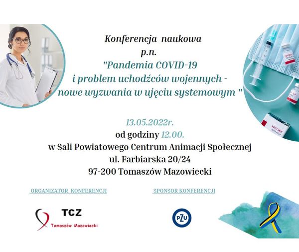 W piątek, 13 maja 2022 roku, w Sali konferencyjnej w Powiatowym Centrum Animacji Społecznej w Tomaszowie Mazowieckim odbędzie się konferencja naukowa pt. „Pandemia COVID-19 i problem uchodźców wojennych - nowe wyzwania w ujęciu systemowym”. Organizatorem konferencji jest Tomaszowskie Centrum Zdrowia, a sponsorem PZU.