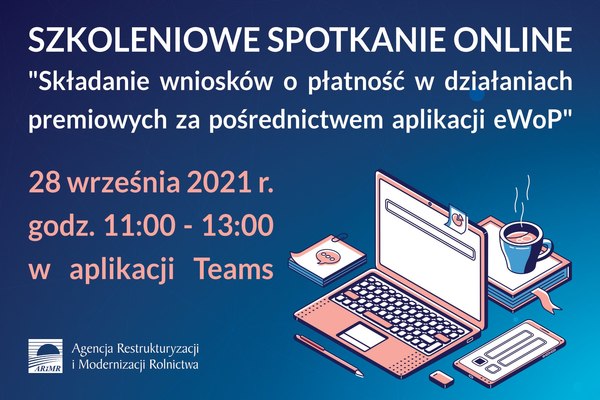 28 września 2021 r. w godz. 11:00 – 13:00 odbędzie się organizowane przez Łódzki Oddział Regionalny Agencji Restrukturyzacji i Modernizacji Rolnictwa szkolenie online dla rolników i doradców, którego tematem będzie "Składanie wniosków o płatność w działaniach premiowych za pośrednictwem aplikacji eWoP".